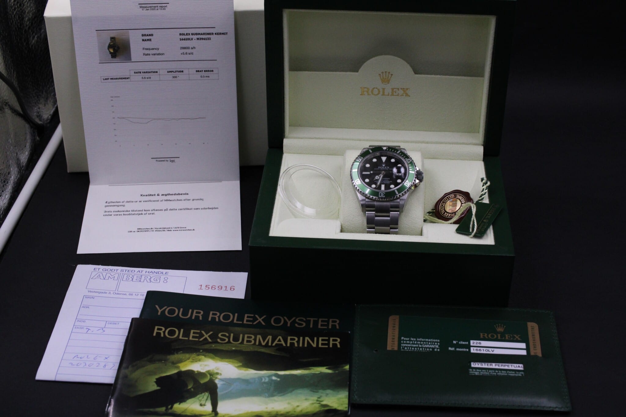 Rolex Submariner, ref. 16610LV “Kermit” M-serie fra 2008 solgt hos dansk forhandler i nærmest ny stand.