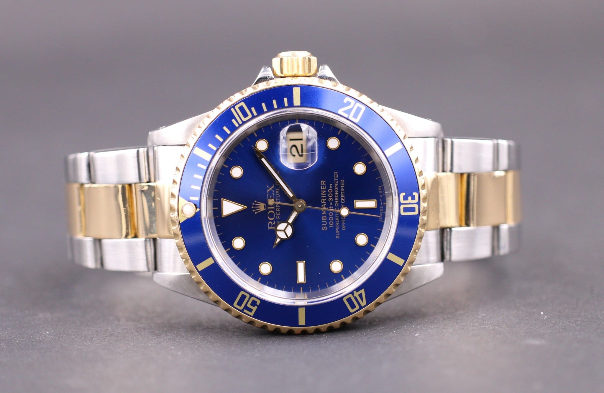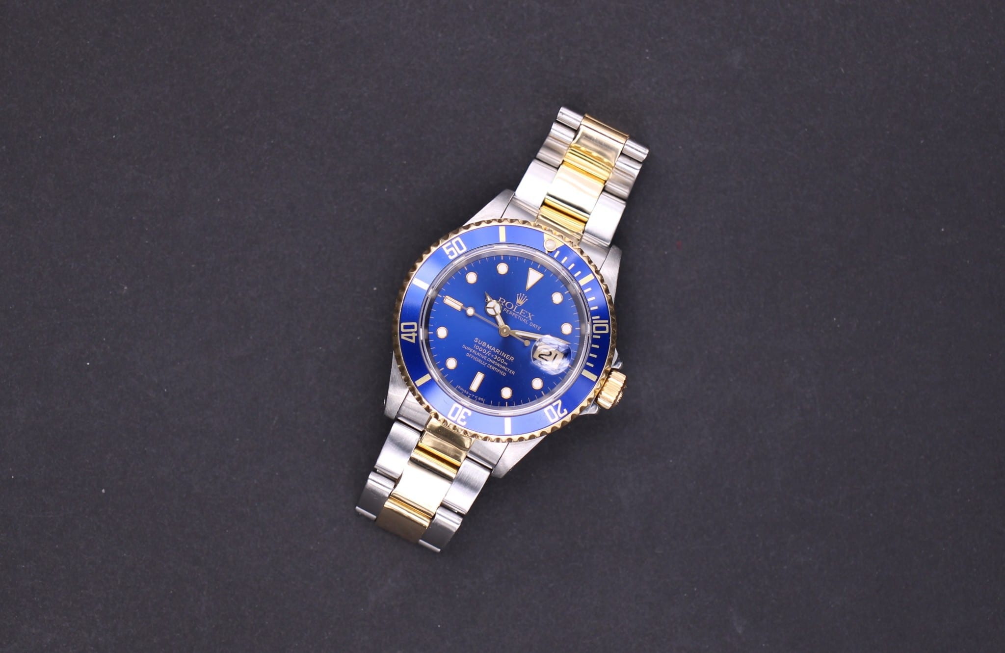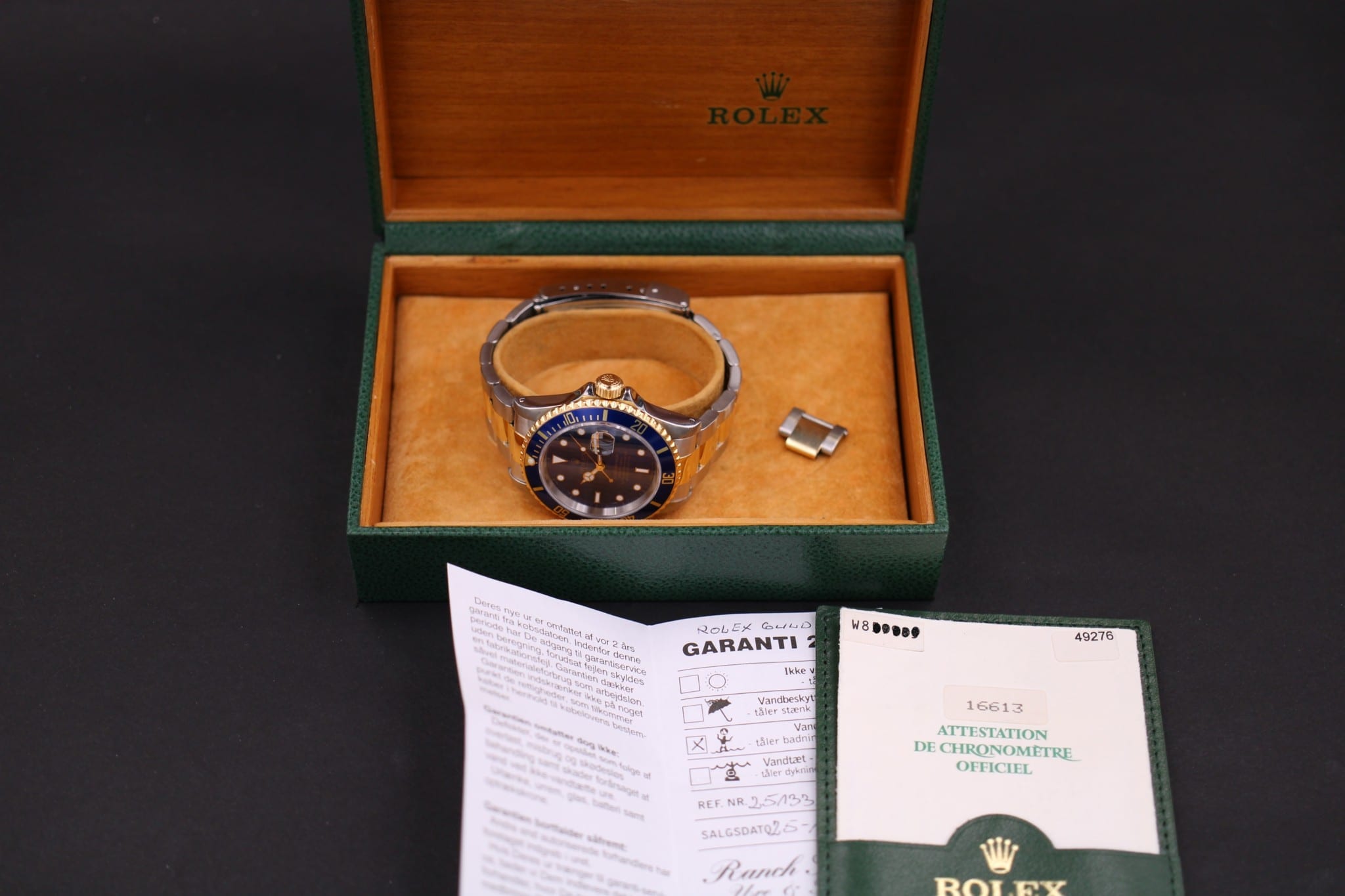 Lækker Rolex Submariner, ref. 16613 udført i guld og stål. Solgt første gang 1997 hos Klarlund.