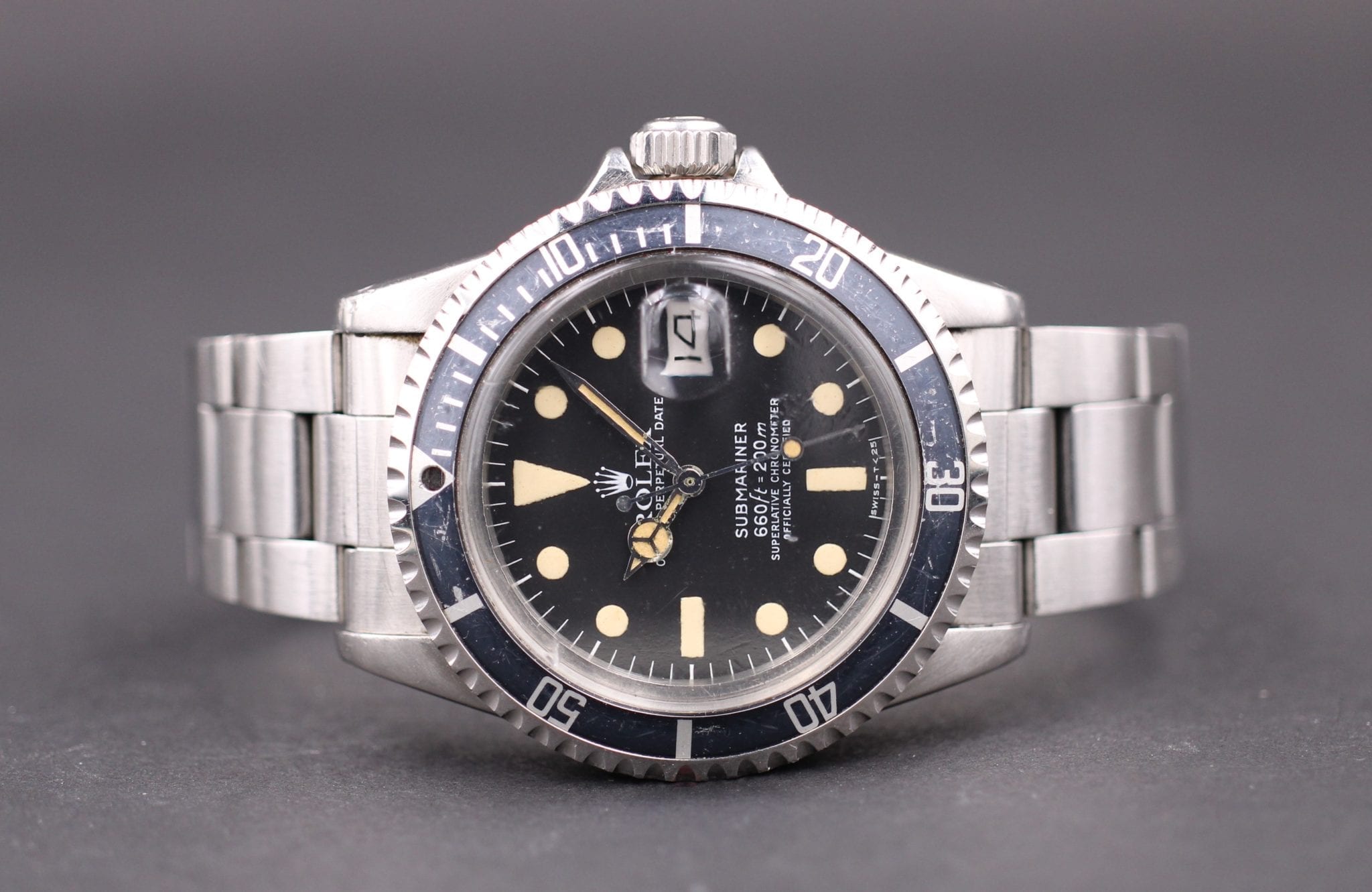 skiven er på et tidspunkt blevet skiftet til en hvid ref. 1680 skive som er flot patineret og matcher viserne rigtigt fint. Endvidere har uret et virkeligt lækkert fadet fat font mk3 indlæg. Uret har tidligere været poleret, men fremstår endnu flot. lænke uden nævneværdig stræk.