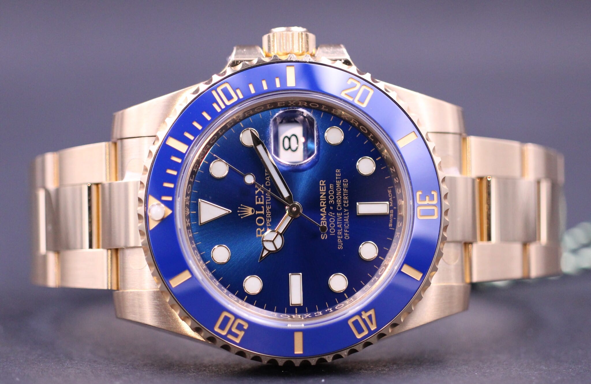 Uret er med den Keramiske krans, og den nyeste model af Submarineren. Uret er monteret med den super flotte blå sunburst skive og udført i 18k guld. Uret er med et cal. 3135 værk og låsen er udstyret med Glidelock extension.