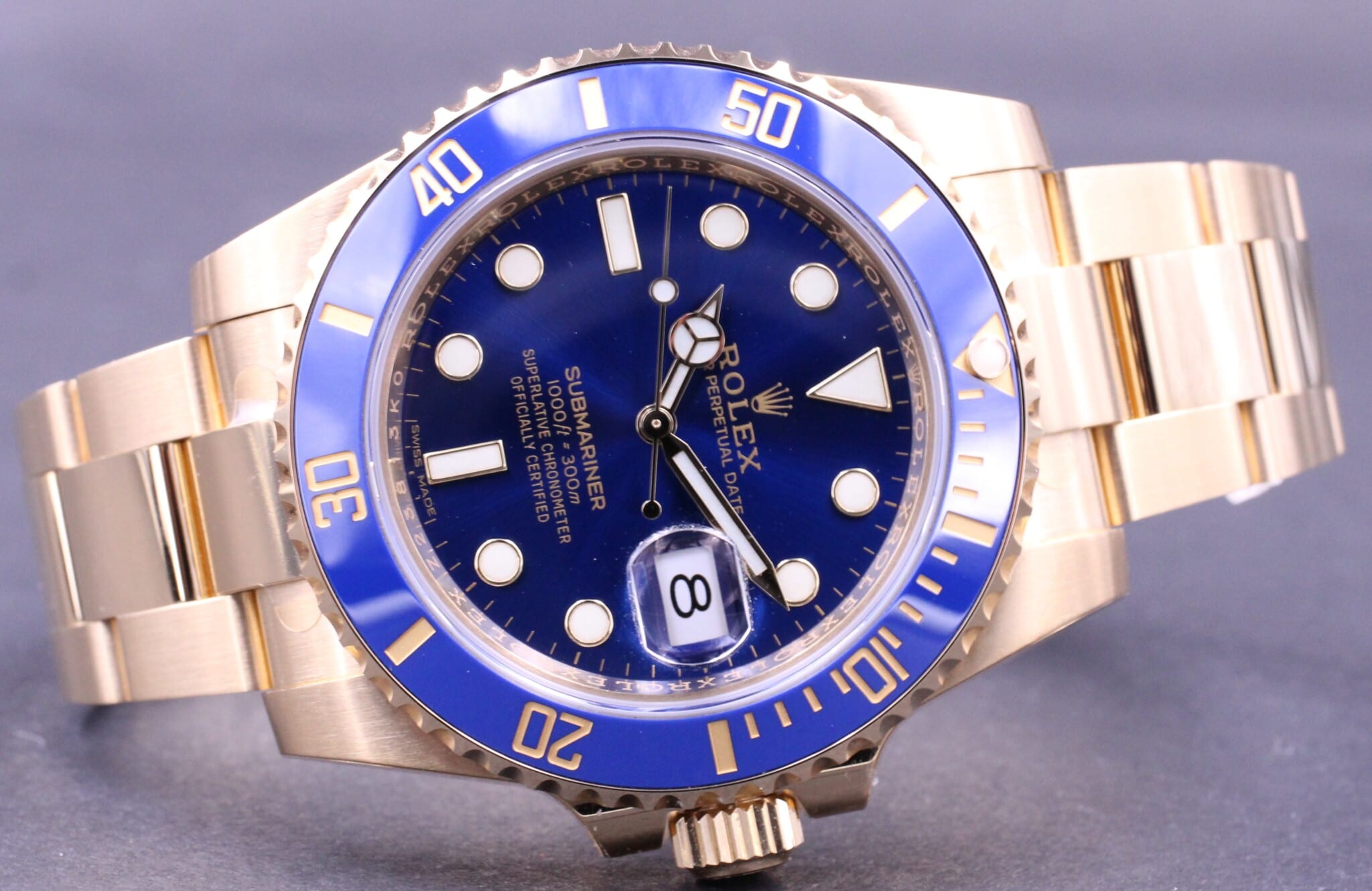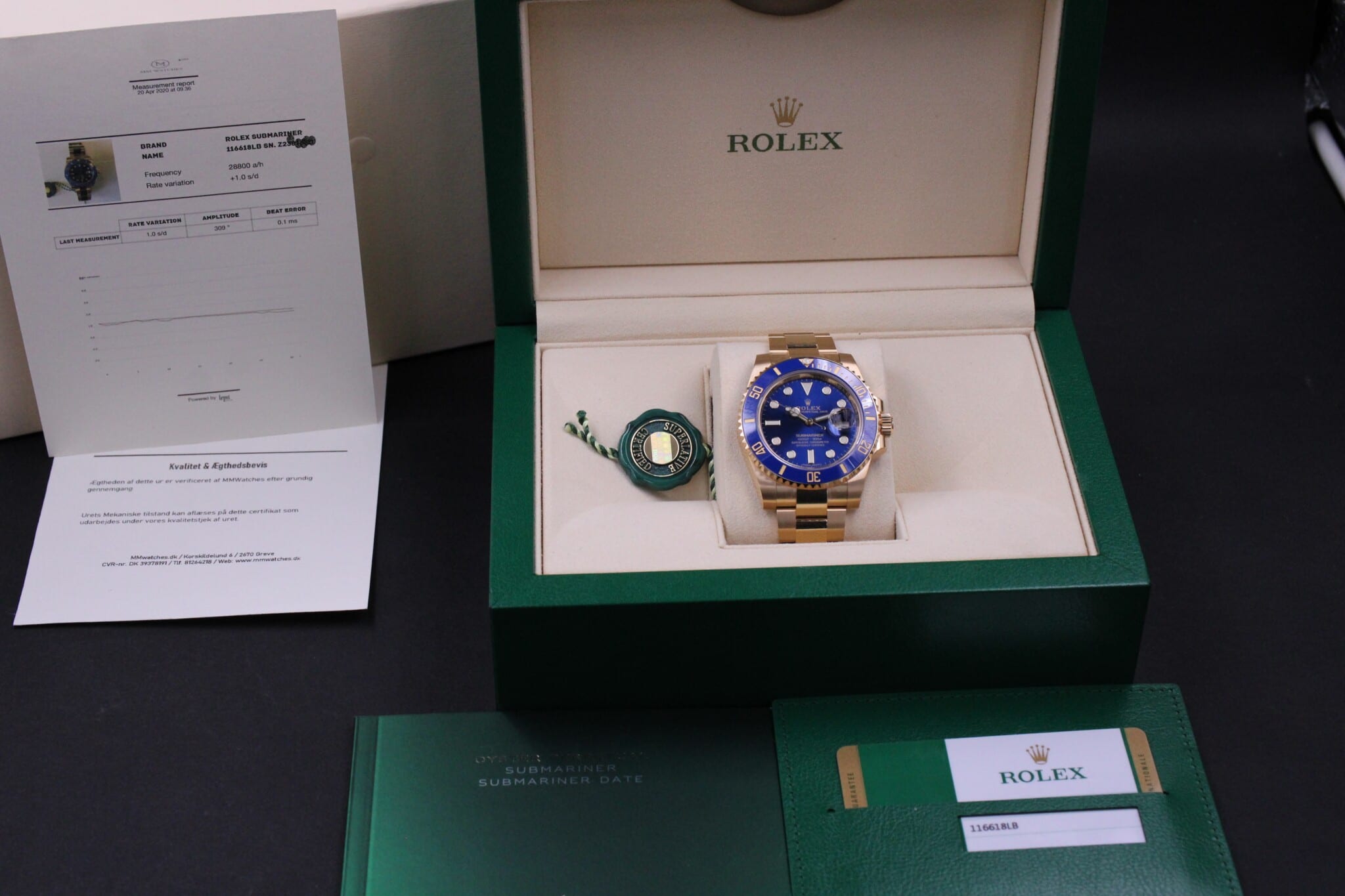 Rolex Submariner, ref. 116618LB i 18k guld. Uret er fabriksnyt og stadig i folie. Solgt i Spanien, i slutningen af oktober 2019. Dermed omfattet af Rolex World Wide Garanti til 2024.