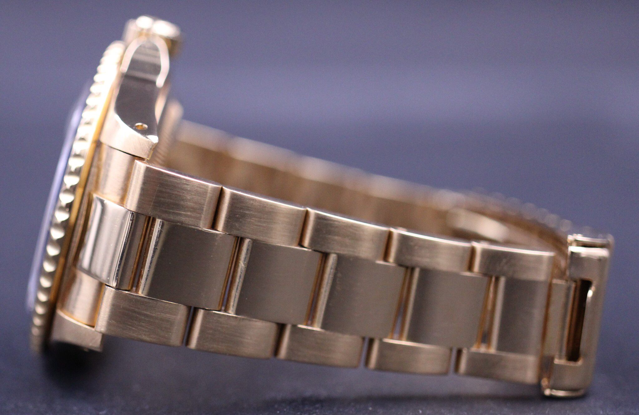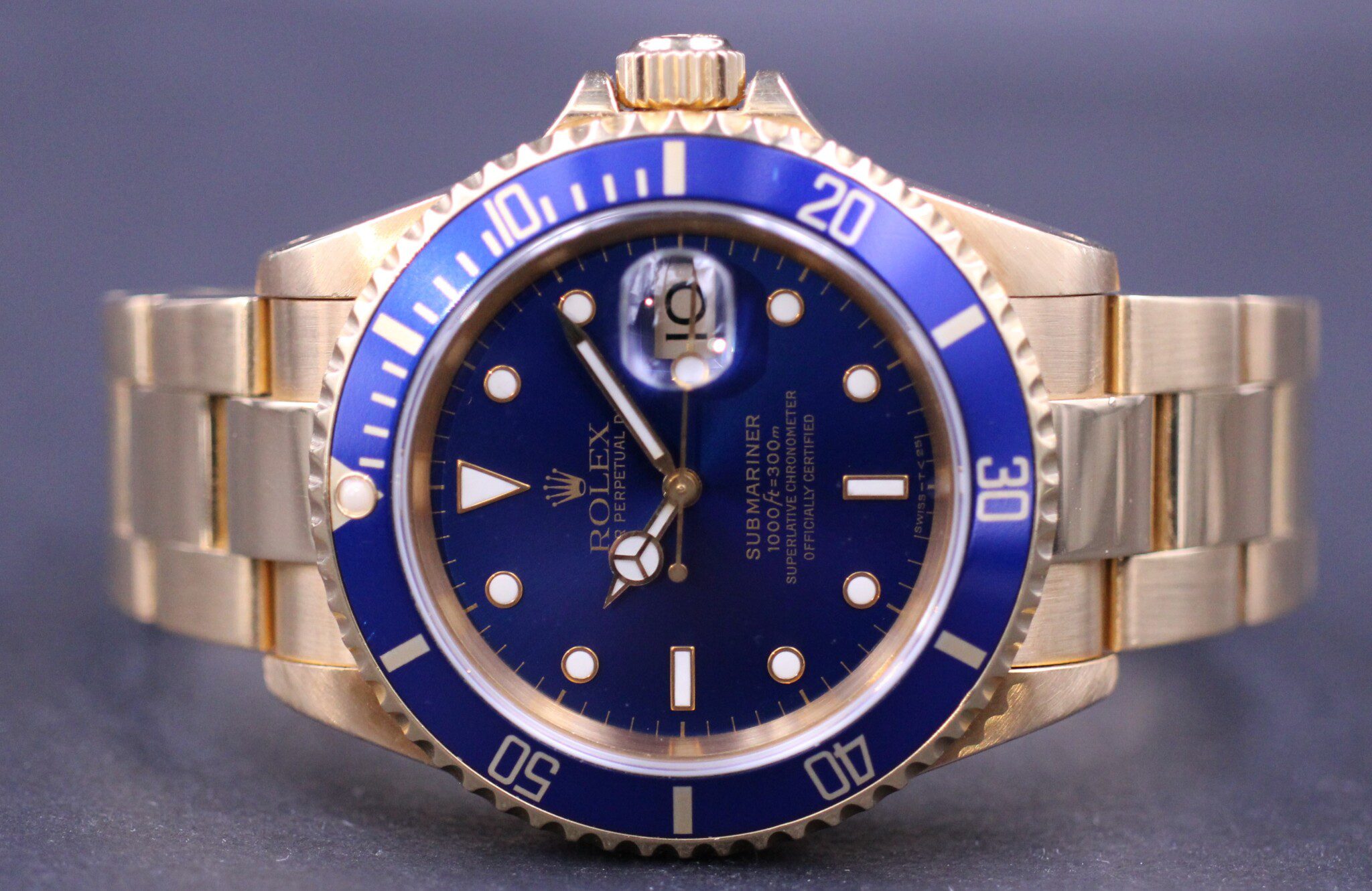 Det klassiske Rolex Submariner dykkerur, her i den eksklusive udgave udført i 18K guld. Uret er med en super lækker blå/ skive med guld timemarkeringer og visere samt safirglas. Uret drives af et Cal. 3135 værk.