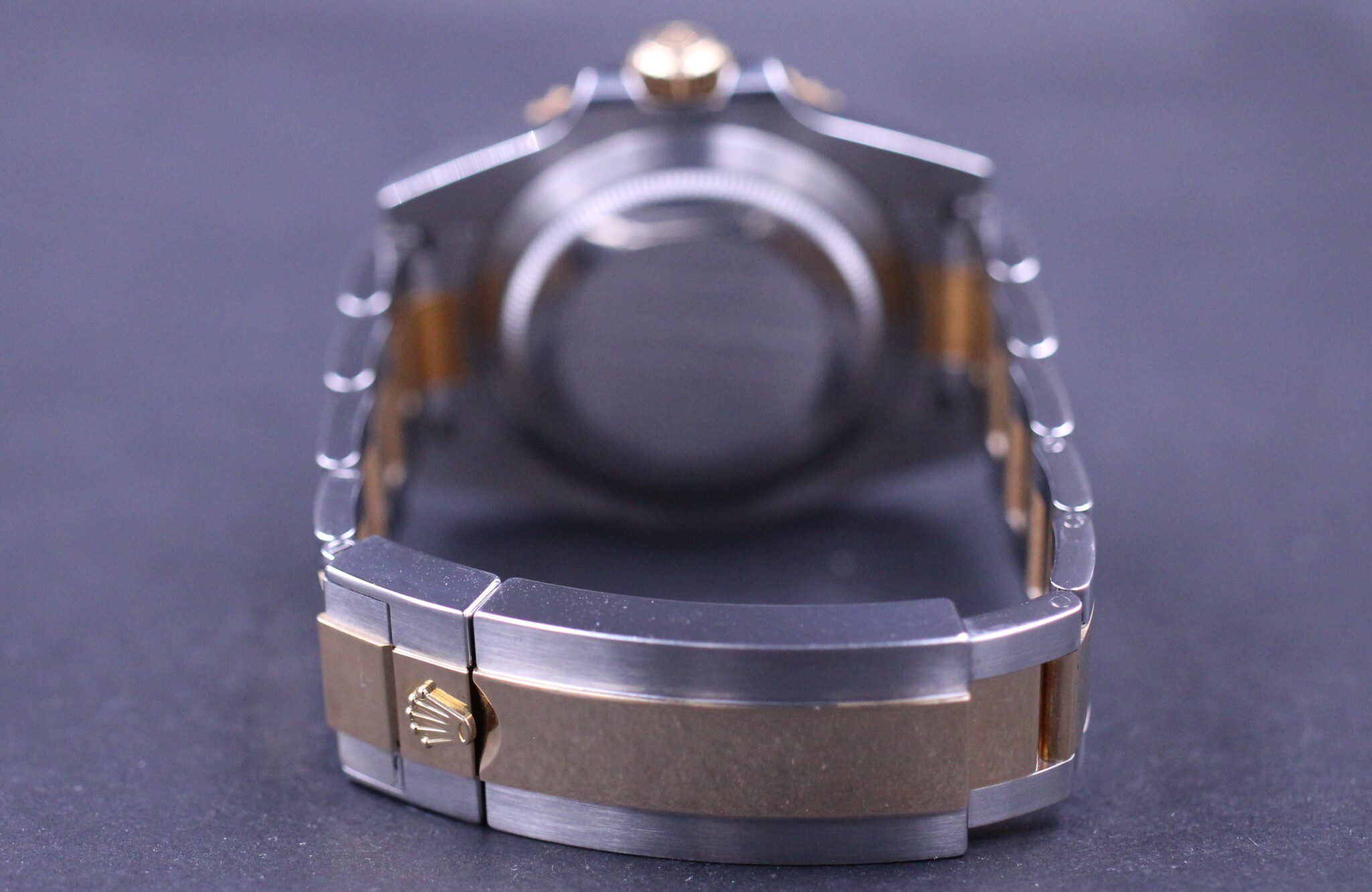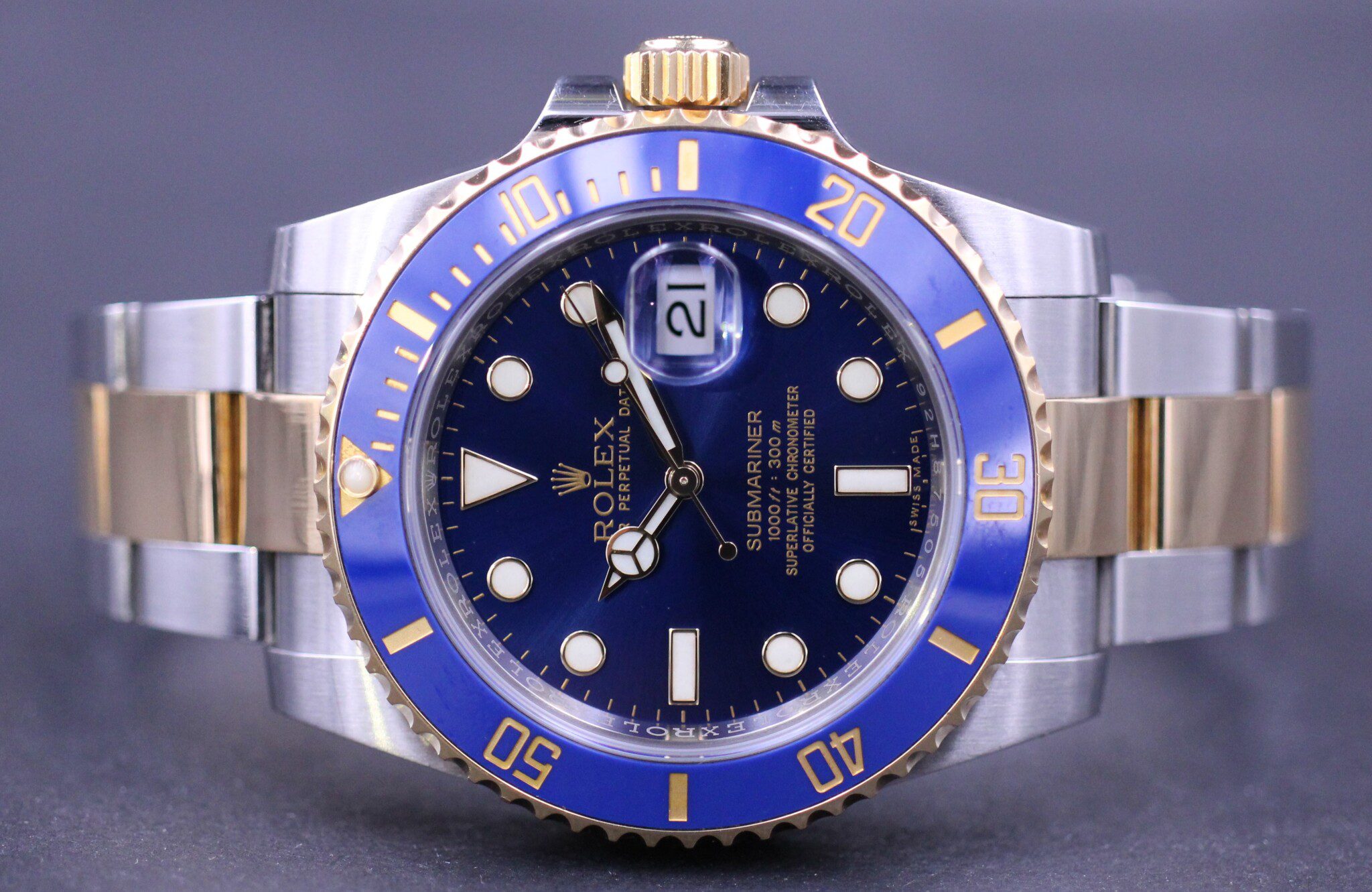 Den udgåede Submariner med den keramiske blå krans. Uret er monteret med den super flotte blå sunburst skive og udført i guld/stål. Uret er med et cal. 3135 værk og låsen er udstyret med Glidelock extension.