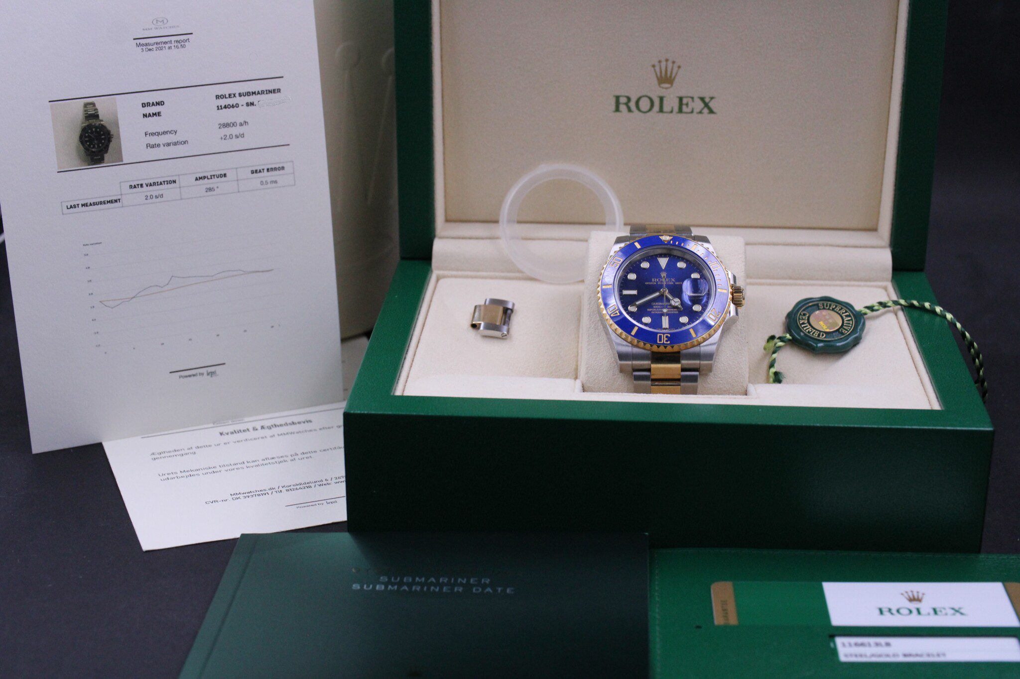 Uret kommer som et komplet sæt med bokse, certifikat, manualer, hangtag, bezel beskytter, mv.