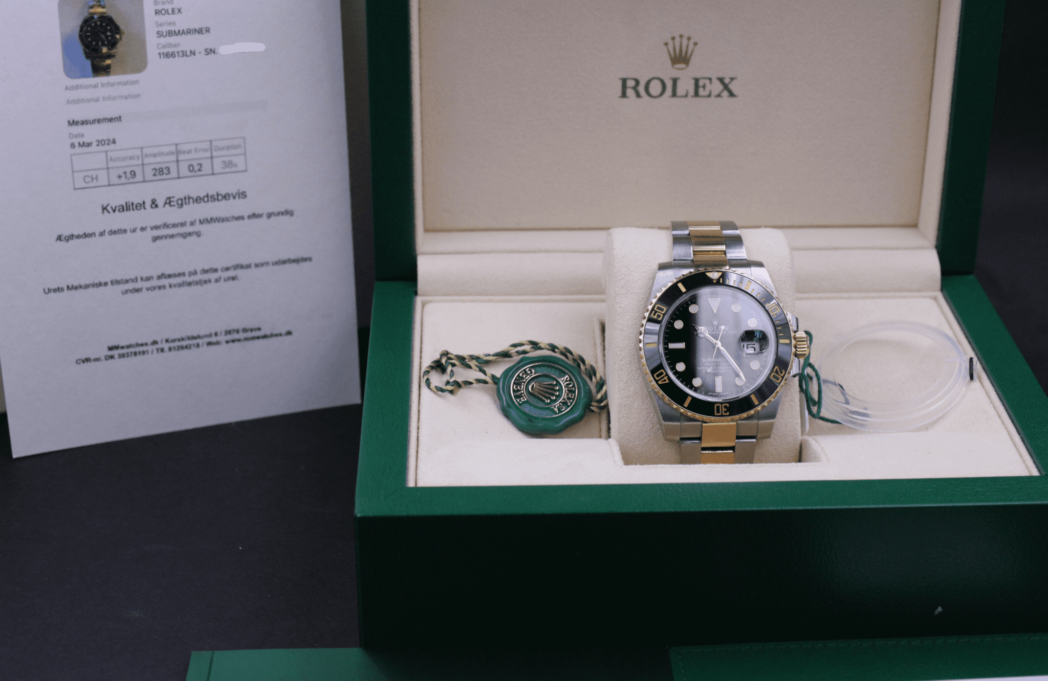 Uret kommer som et komplet sæt med bokse, certifikat, manualer, hangtag, mv.