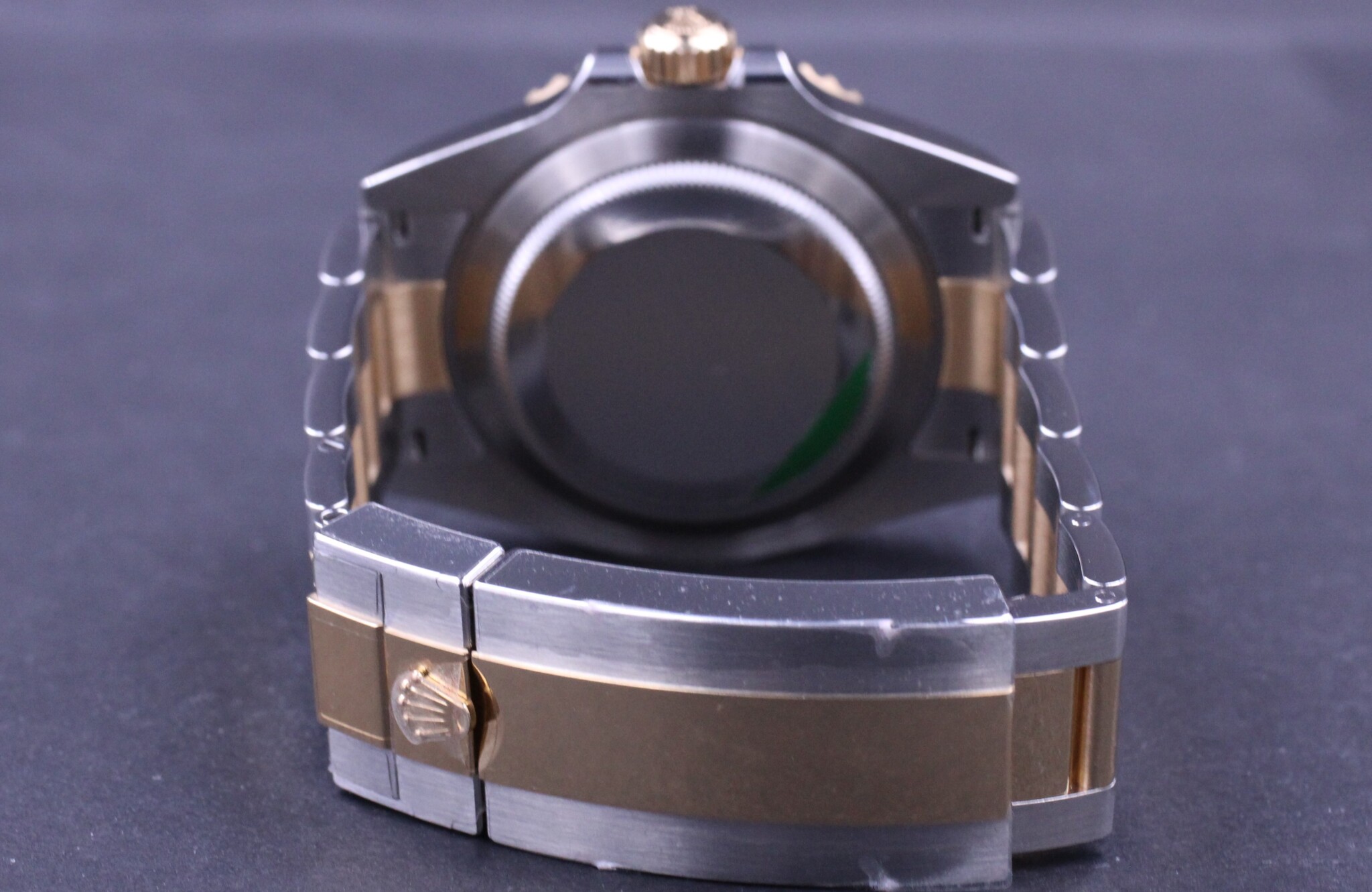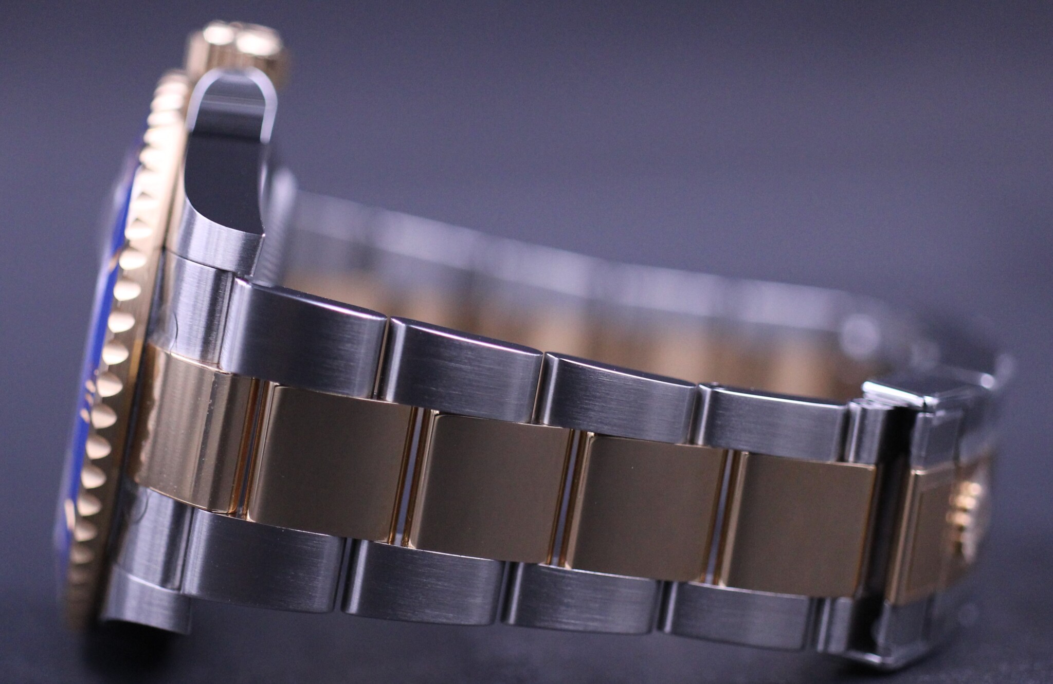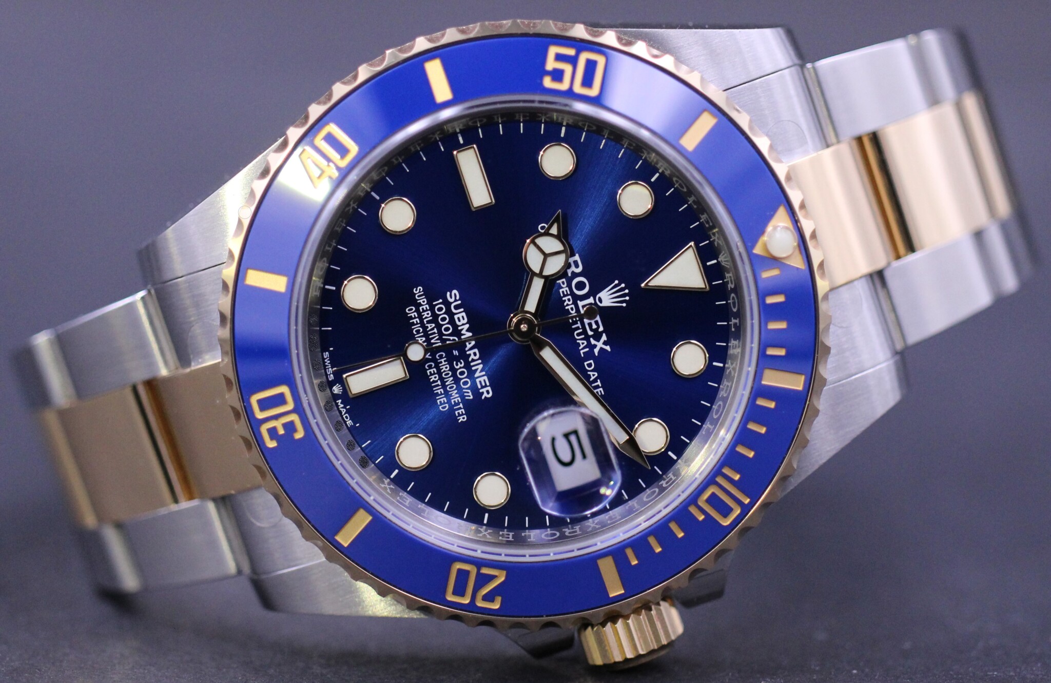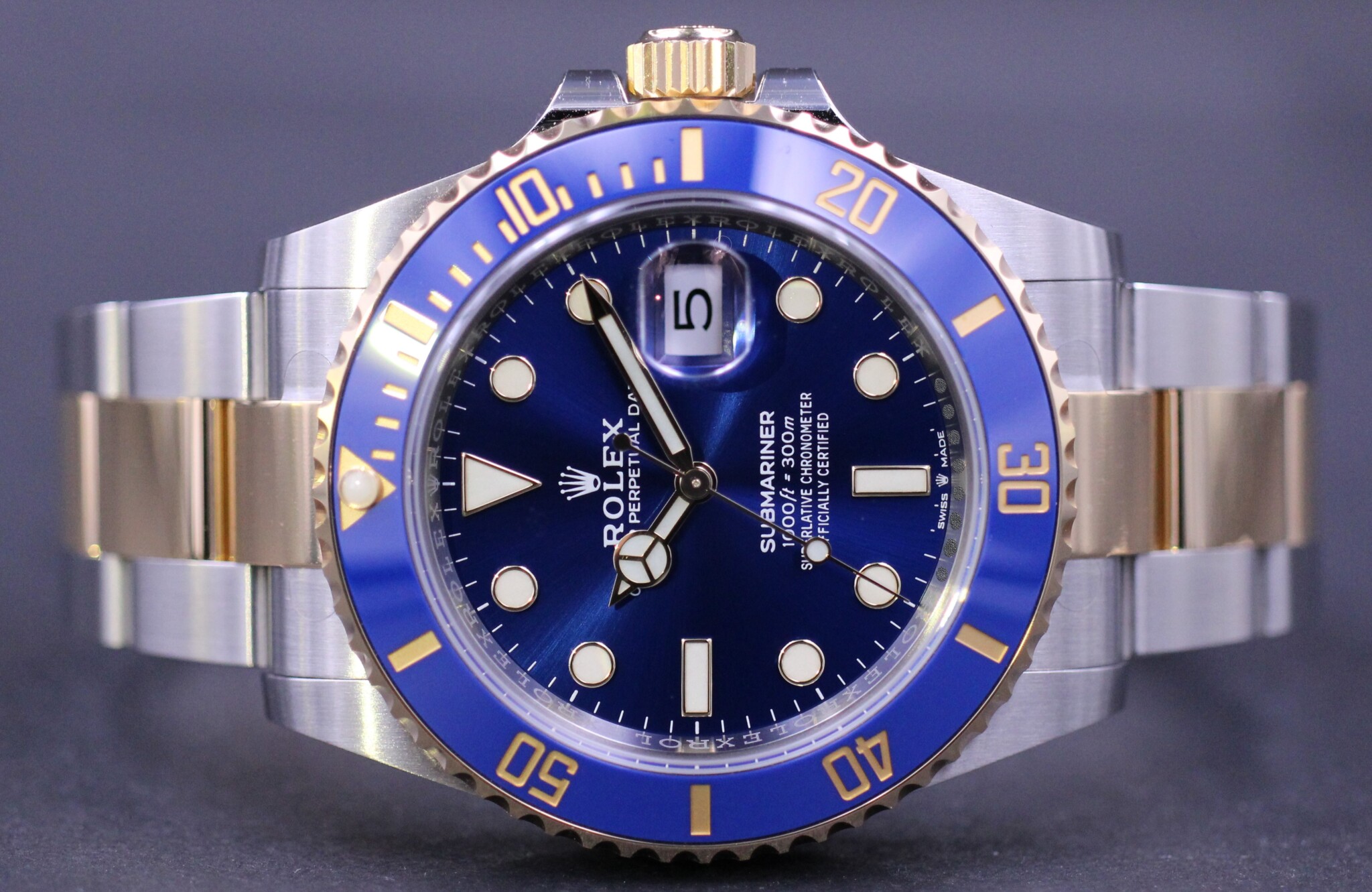 Rolex’ vel nok mest klassiske Submariner design og med det opgraderede Rolex Cal. 3235 værk, blue parachrom hairspring og udført i guld og stål.