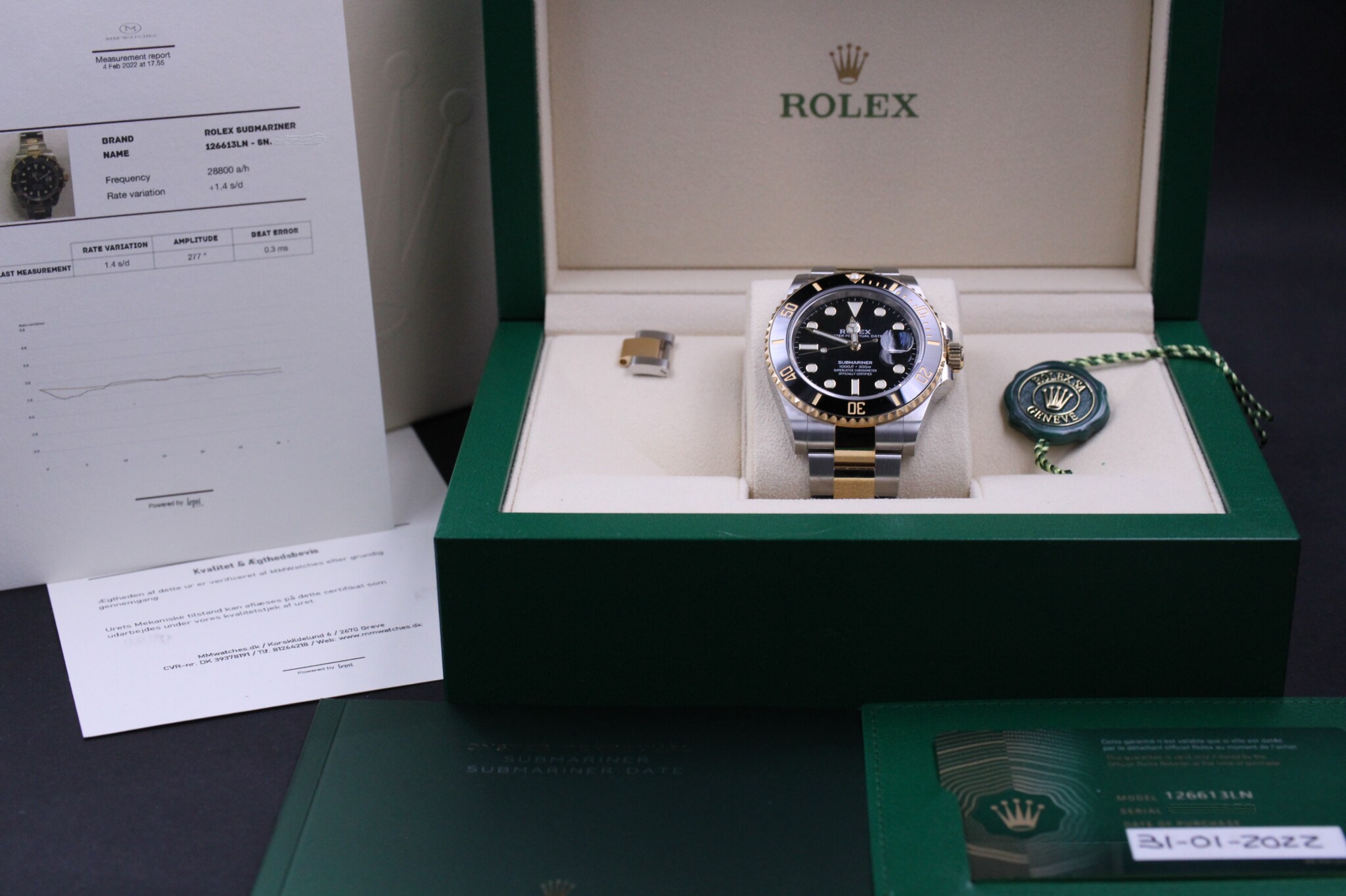 Den helt nye Rolex Submariner ref. 126613LN. Uret her er fra Januar 2022 og er dermed dækket af Rolex World Wide Garanti til 2027. Uret er i fabriksny stand.