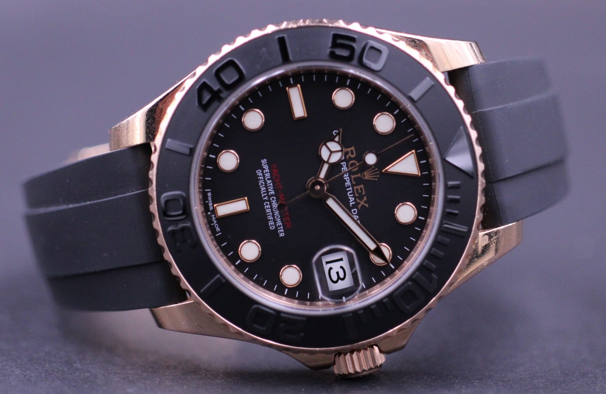 Super elegant Rolex Yacht-Master på 37mm udført i 18K Everose guld. Uret sidder på en Rolex Oysterflex rem som giver uret et sporty look. Uret har monteret en super flot at sort keramisk lynette.