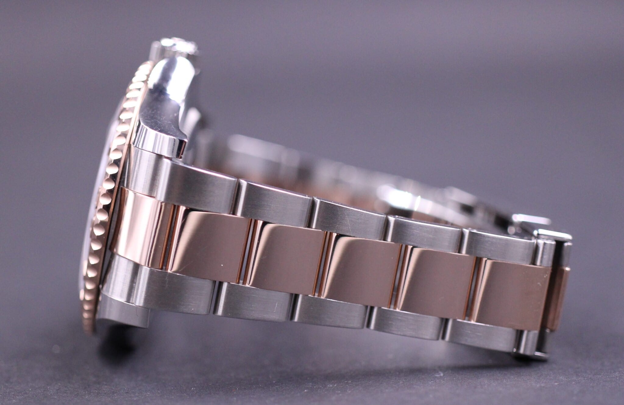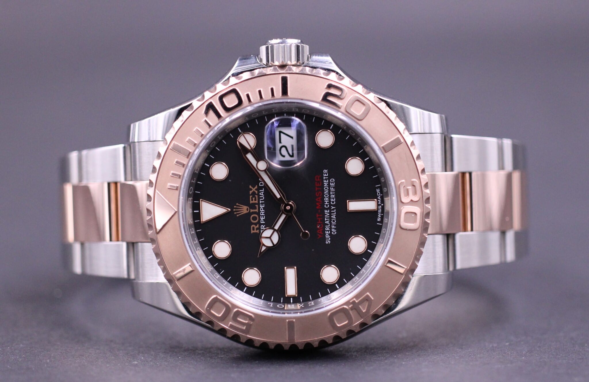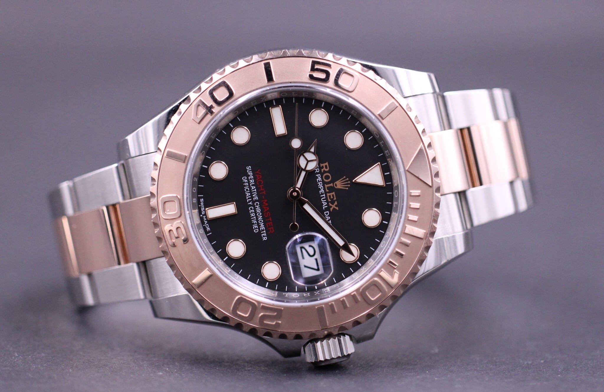 Seneste model af Yacht-Master med lynette i 18K Rosegold kombineret med den smukke semi matte sorte dial.
