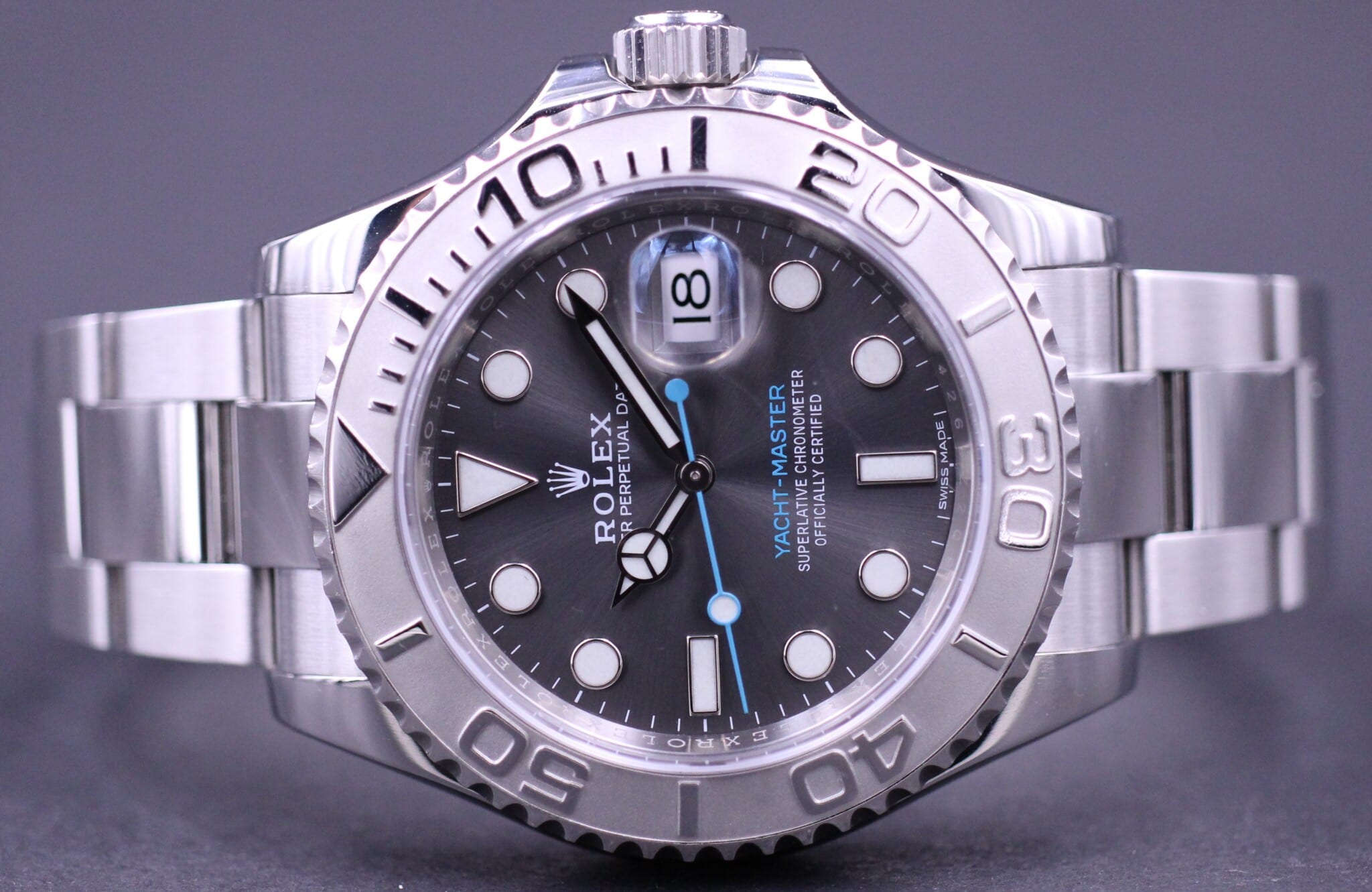 Super flot Yacht-Master med den nye smukke Rhodium maxi skive. Uret kommer med en lynette af platin.
