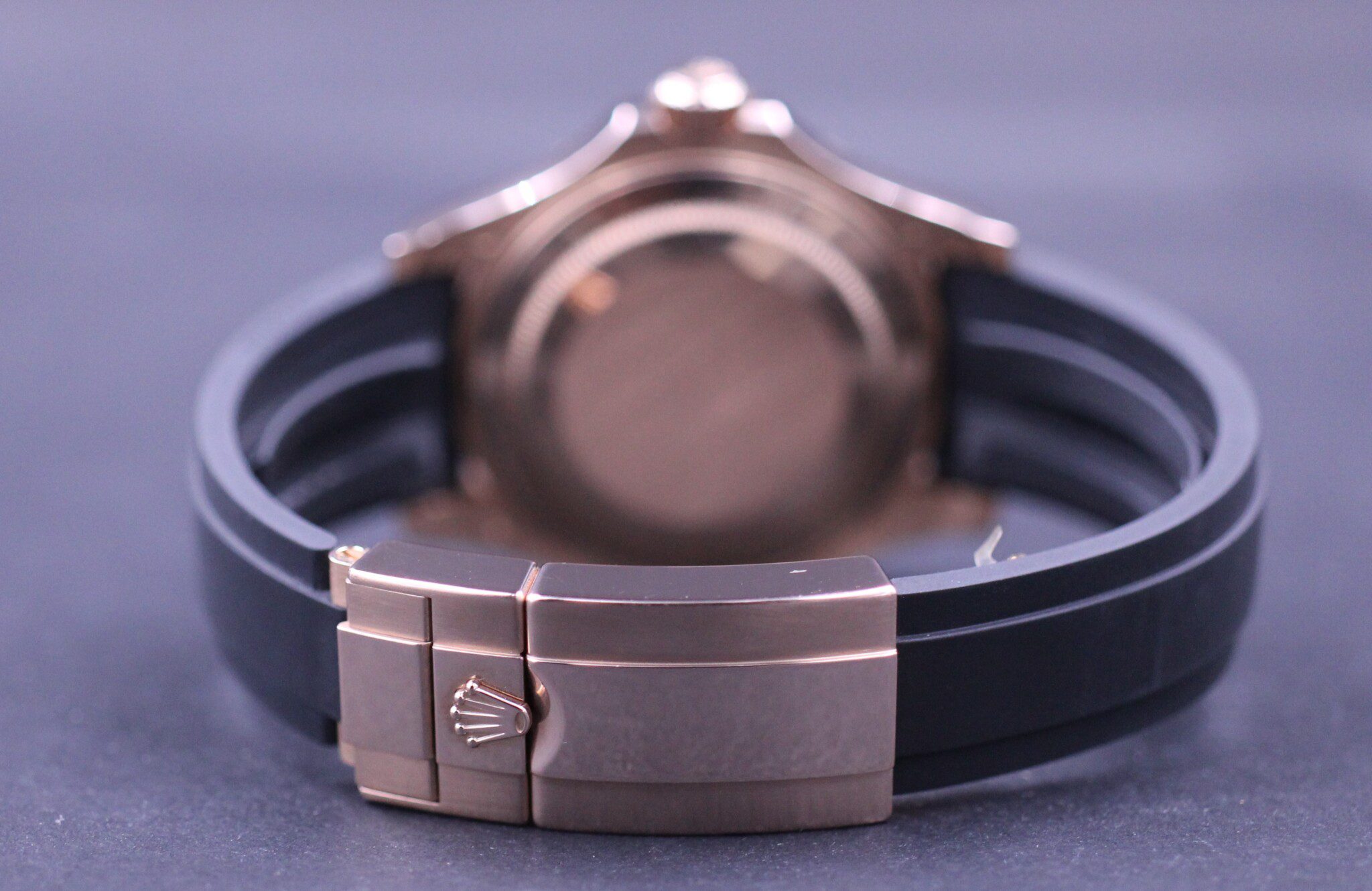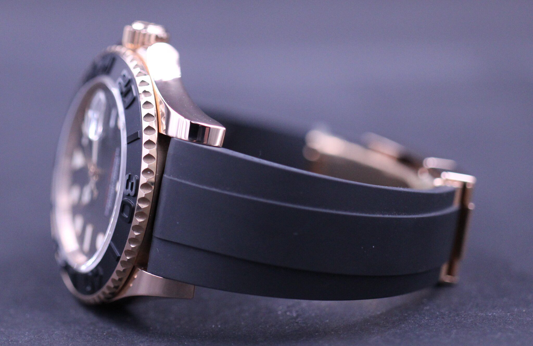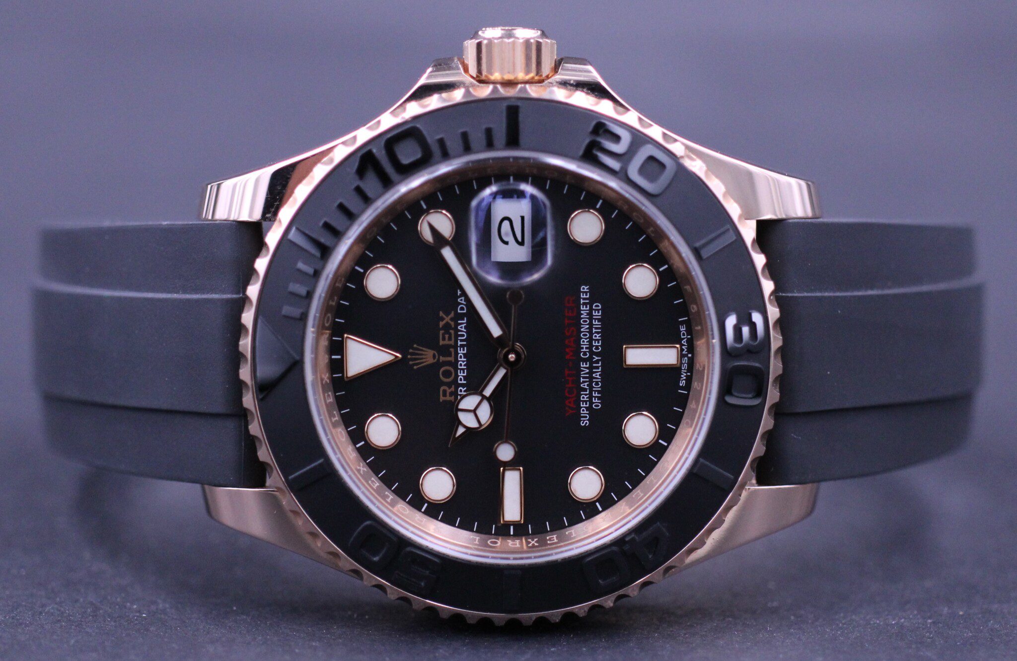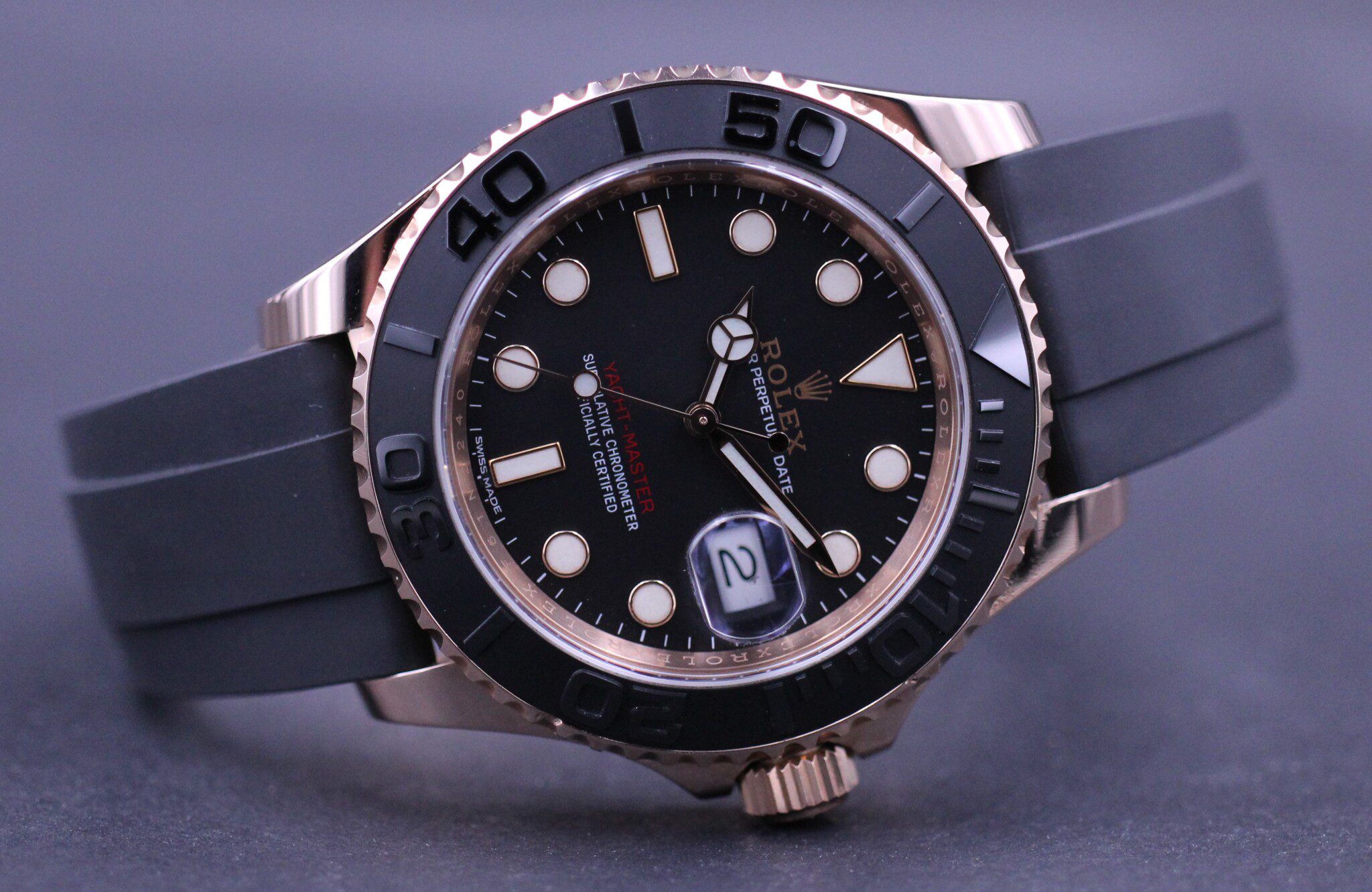 Super elegant Rolex Yacht-Master på 40mm udført i 18K Everose guld. Uret sidder på en Rolex Oysterflex rem som giver uret et sporty look. Uret har monteret en super flot at sort keramisk lynette.