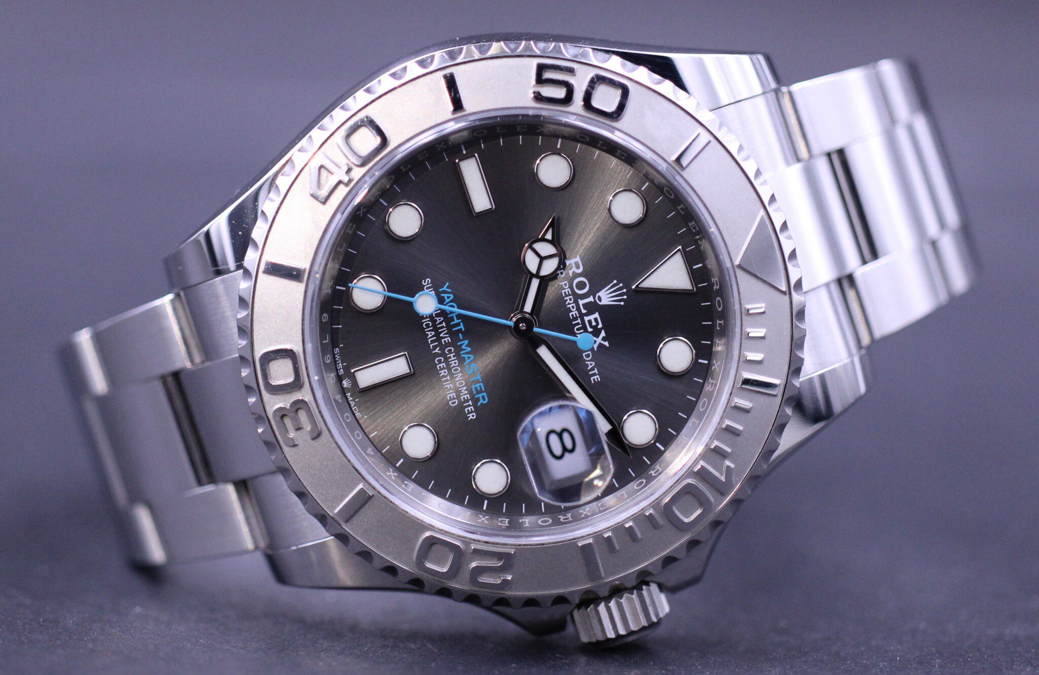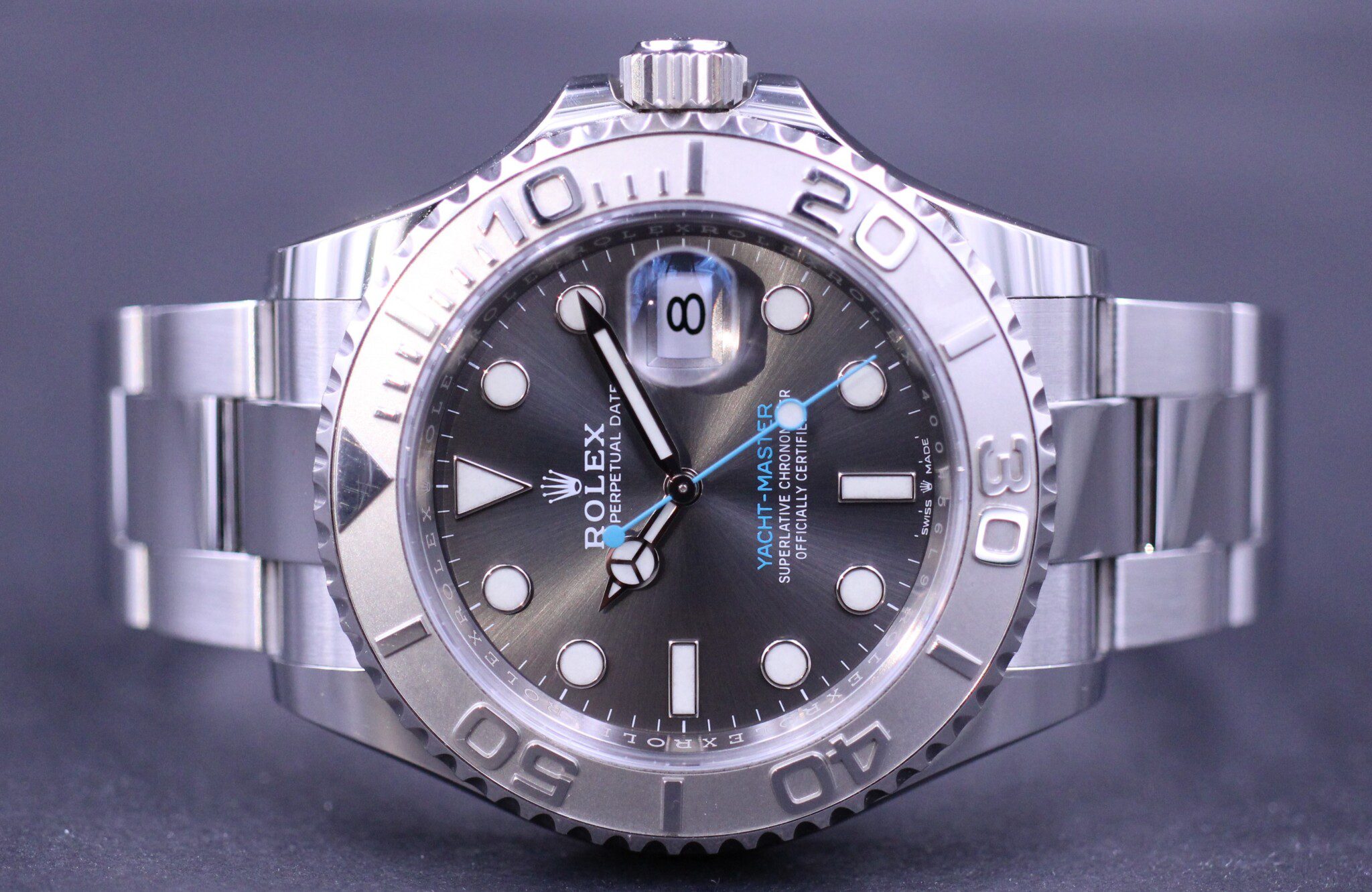 Super flot Yacht-Master med lynette af platin og en smuk blågrå maxi dial. Samlet i en kasse af Rolessor der er en konstruktion af platin og 904L stål.