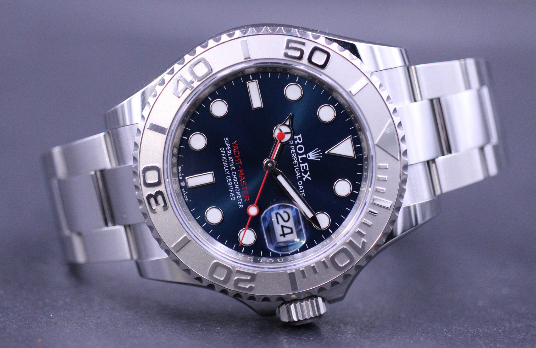 Super flot Yacht-Master med lynette af platin og en smuk blå maxi dial. Samlet i en kasse af Rolessor der er en konstruktion af platin og 904L stål.