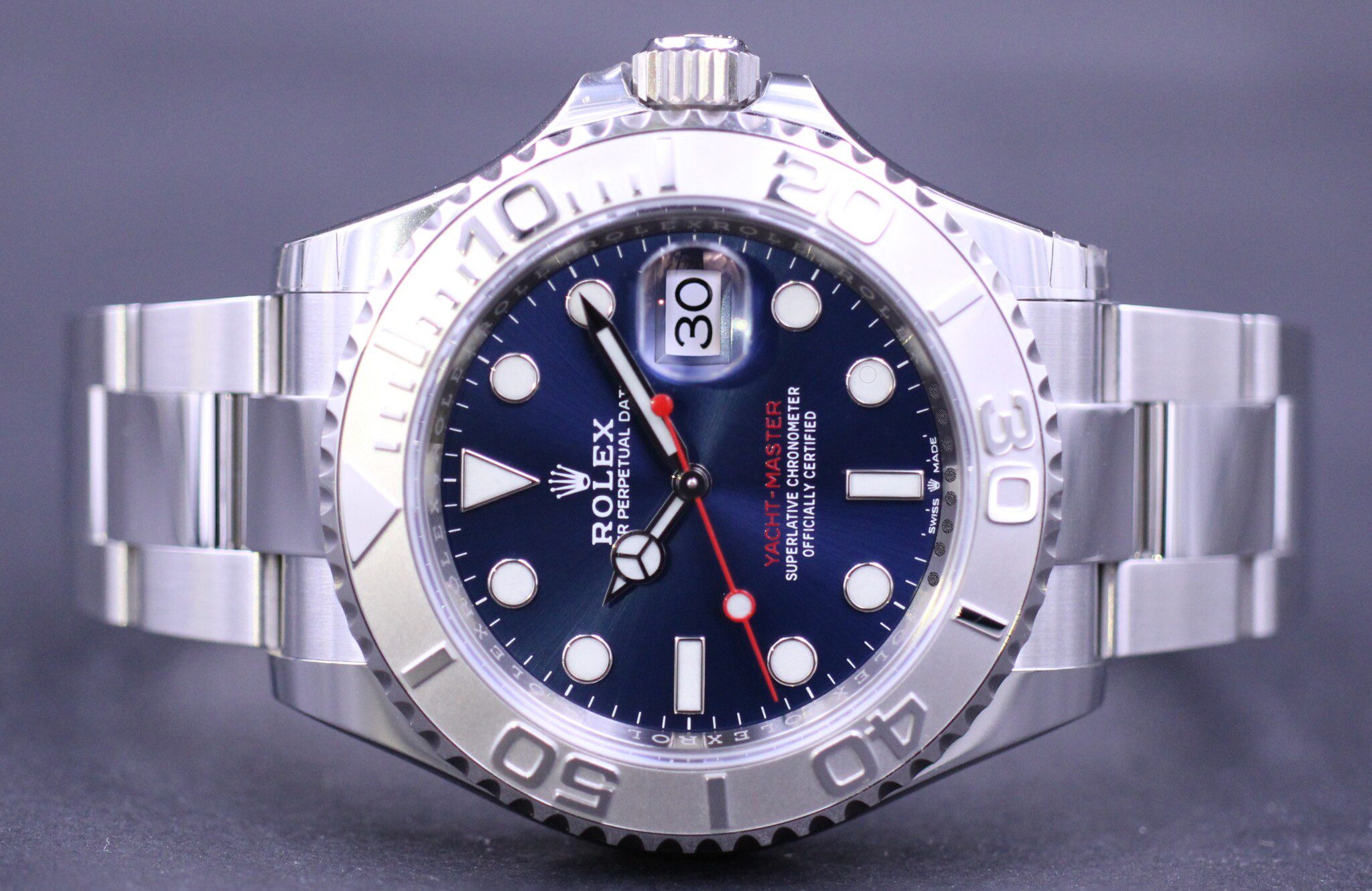 Super flot Yacht-Master med lynette af platin og en smuk blå maxi dial. Samlet i en kasse af Rolessor der er en konstruktion af platin og 904L stål.