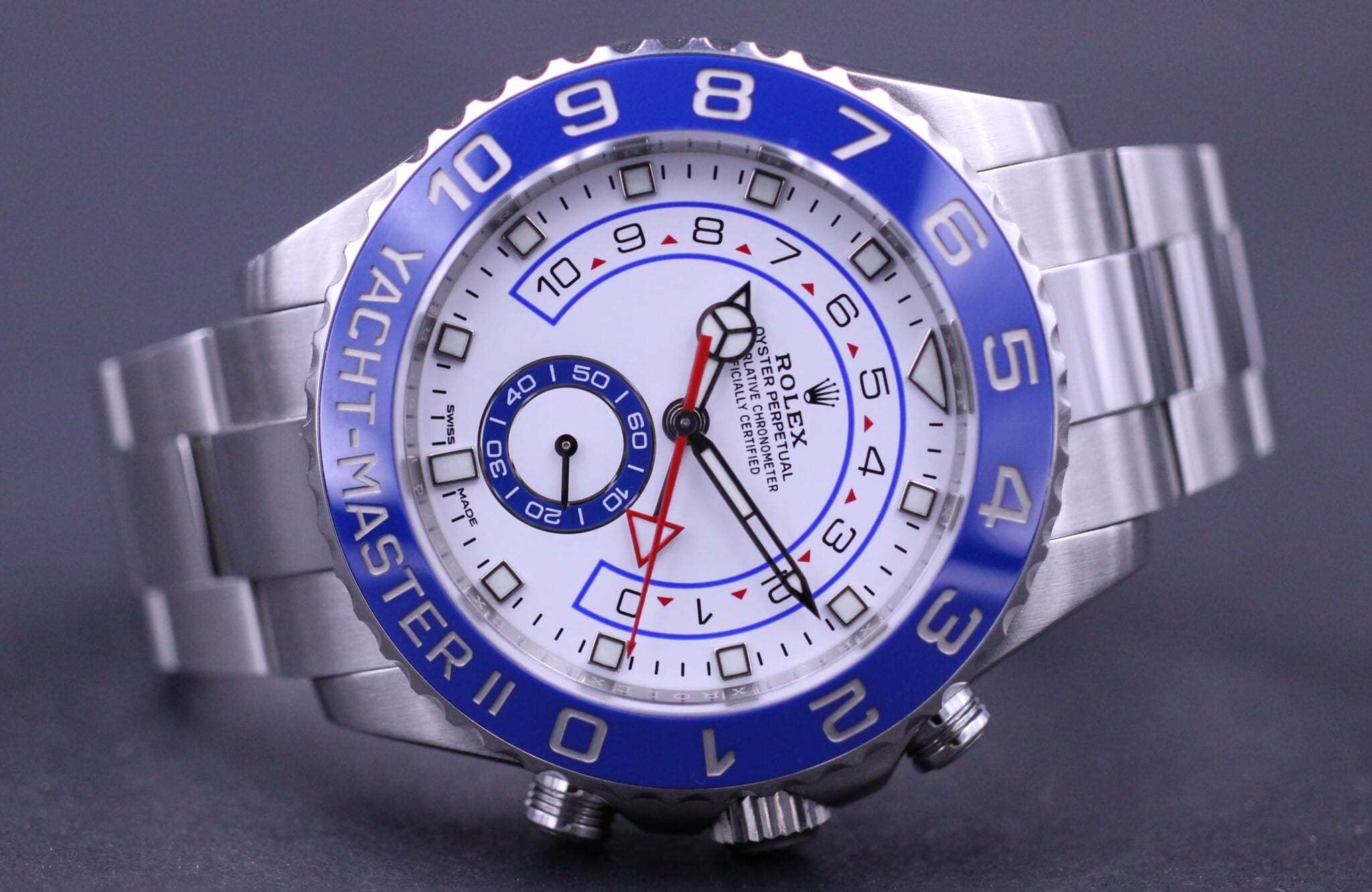 Meget fint og velholdt eksemplar af den nyeste Yacht-Master II, med keramisk krans og smuk hvid skive. Den blå keramiske krans giver uret et helt unikt udseende. Uret måler imponerende 44mm.