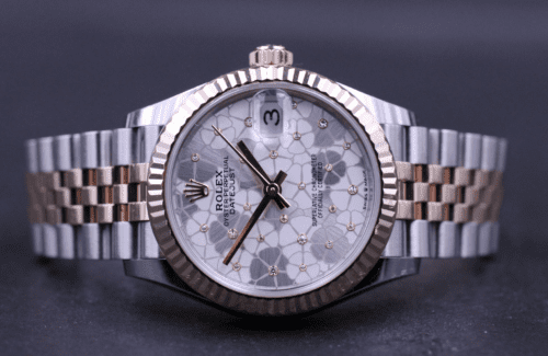 Skiven har en flot matbrun farve med 3-6-9 timemarkeringer. Uret er naturligvis med Snowflake visere.